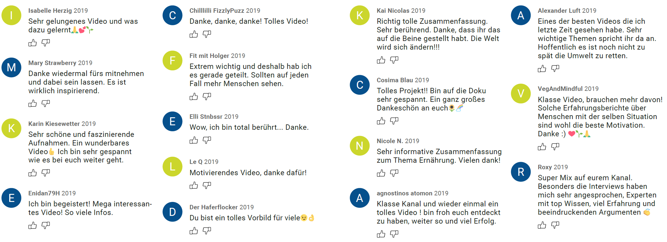 Einen ersten Meilenstein zur Realisierung des Films setzten weit über 200 Unterstützer:innen des Crowdfundings im Herbst 2020. Aktuell (Frühjahr 2024) begleiten wir zwei Proband:innen bei der Ernährungsumstellung und dokumentieren ihren Weg. Dabei halten wir fest, welchen Effekt die Ernährungsumstellung auf ihren gesundheitlichen Verlauf hat und welche Herausforderungen der Alltag bereithält.